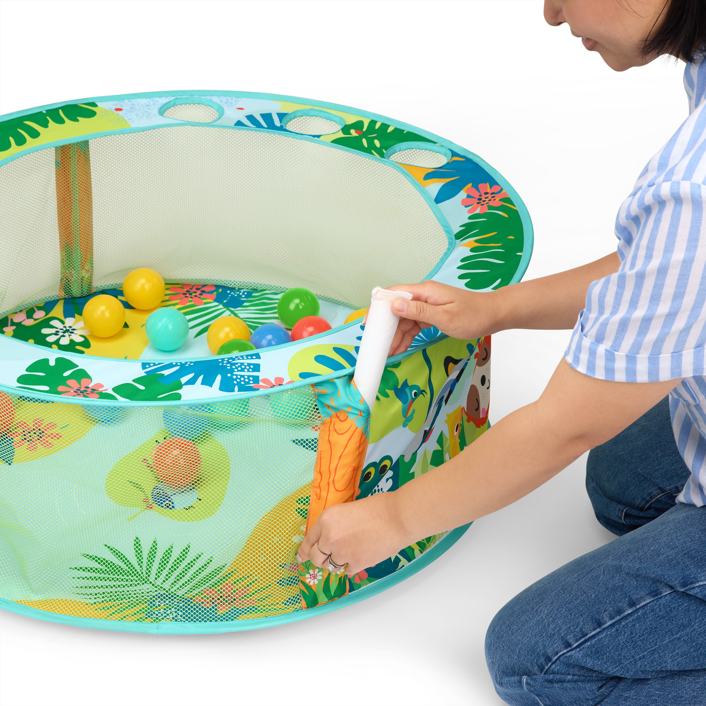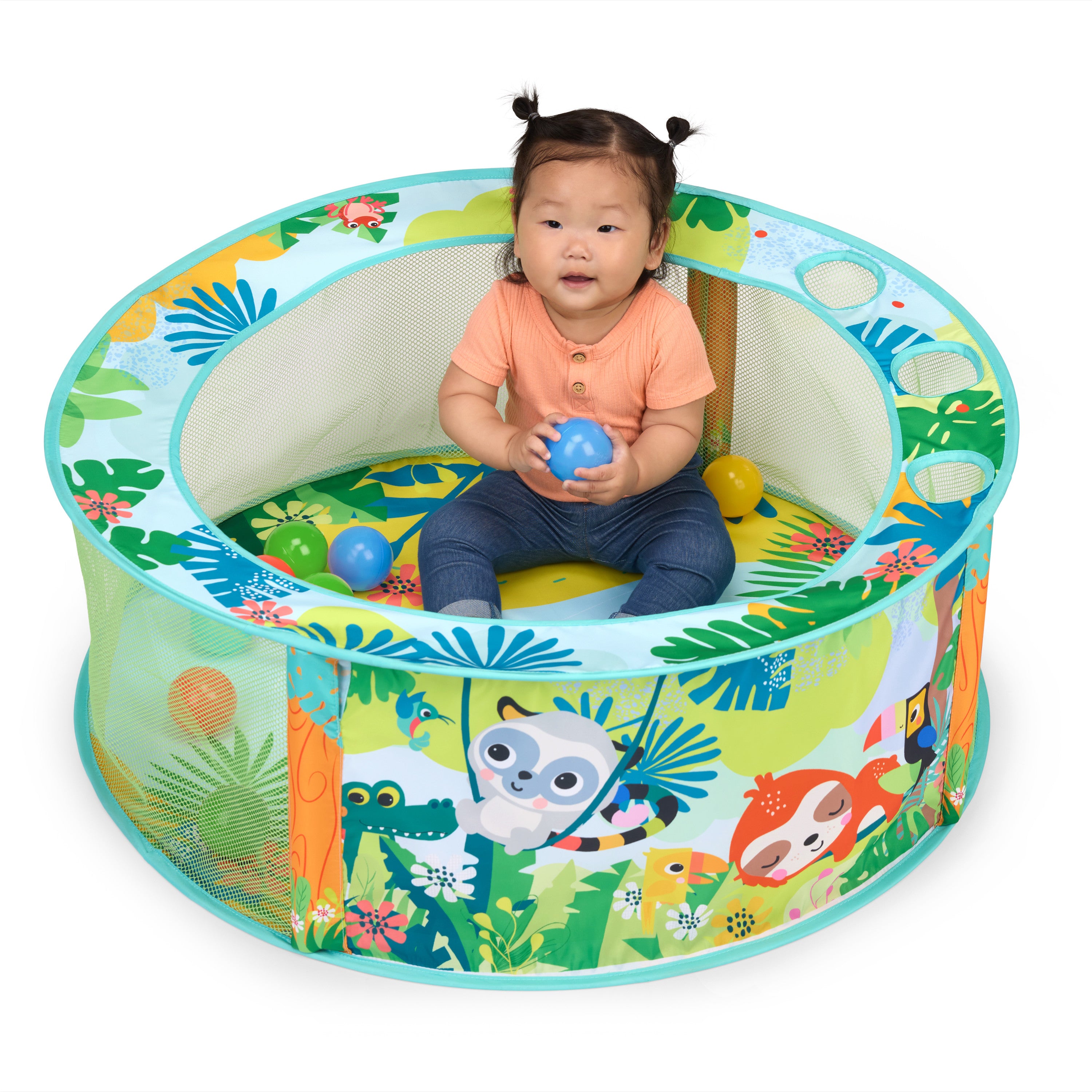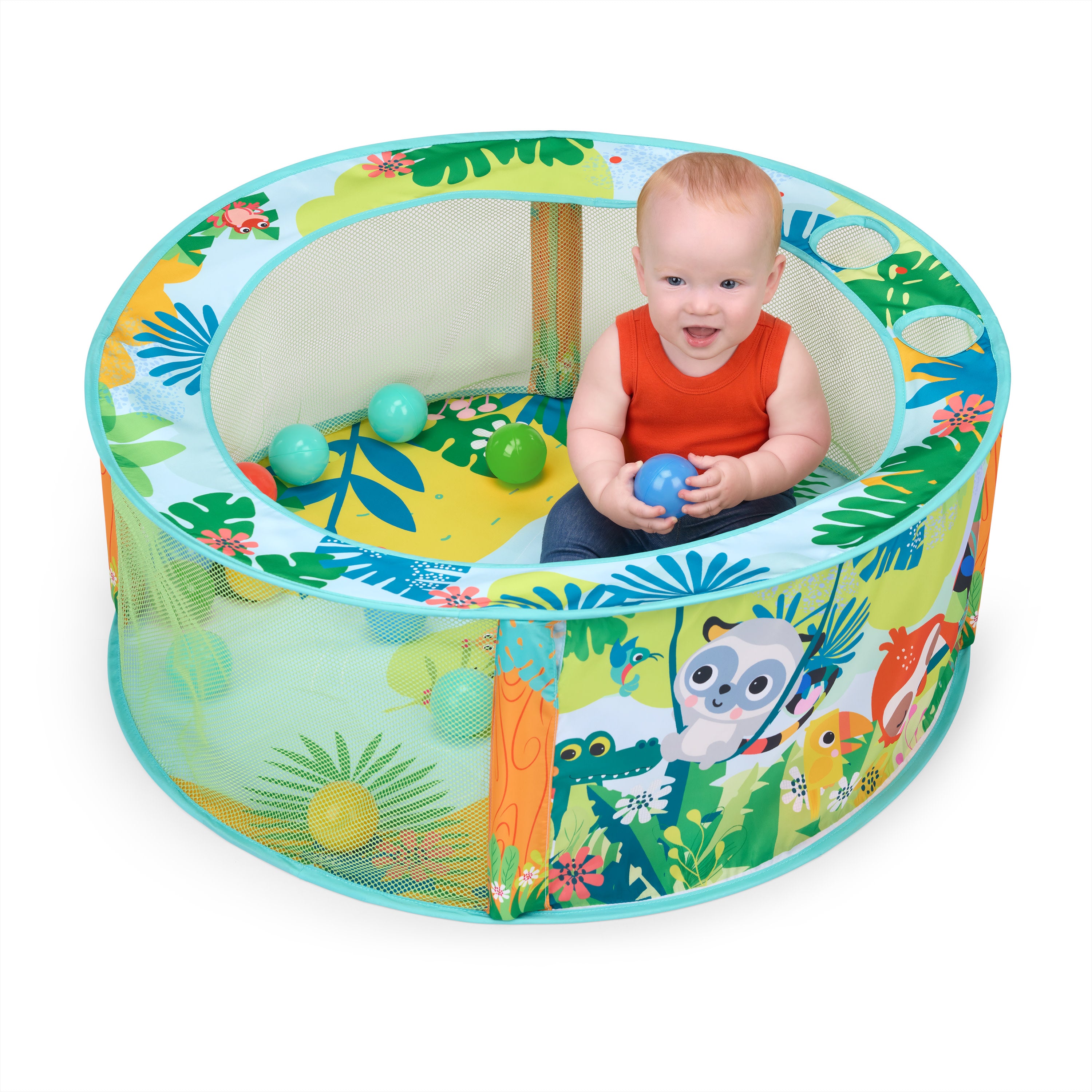 Get ready to have a ball with the Bright Starts Rowdy Rainforest Stow & Go Ball Pit! This foldable baby ball pit comes with 20 balls and a carry bag for sit and play fun wherever the day takes you. Thoughtfully-designed, it immerses your little explorer in a playful rainforest scene featuring Bright Starts animal characters. The ball pit ridge includes 3 ball-drop openings, so baby can practice their fine motor skills. Simply twist and fold down when playtime is over! The exciting baby play gym encourages motor skill development as baby enjoys grasping, tossing, rolling, and catching the colorful balls. Peek-a-boo! The panels are made with a mesh material, so you can keep a close eye on the action. Ideal for small spaces and travel with convenient, compact storage. Makes a great gift for baby showers, birthdays, and holidays like Christmas and Hanukkah. Designed for ages 6 months and up. Opens up to a spacious 31.5” diameter for play.