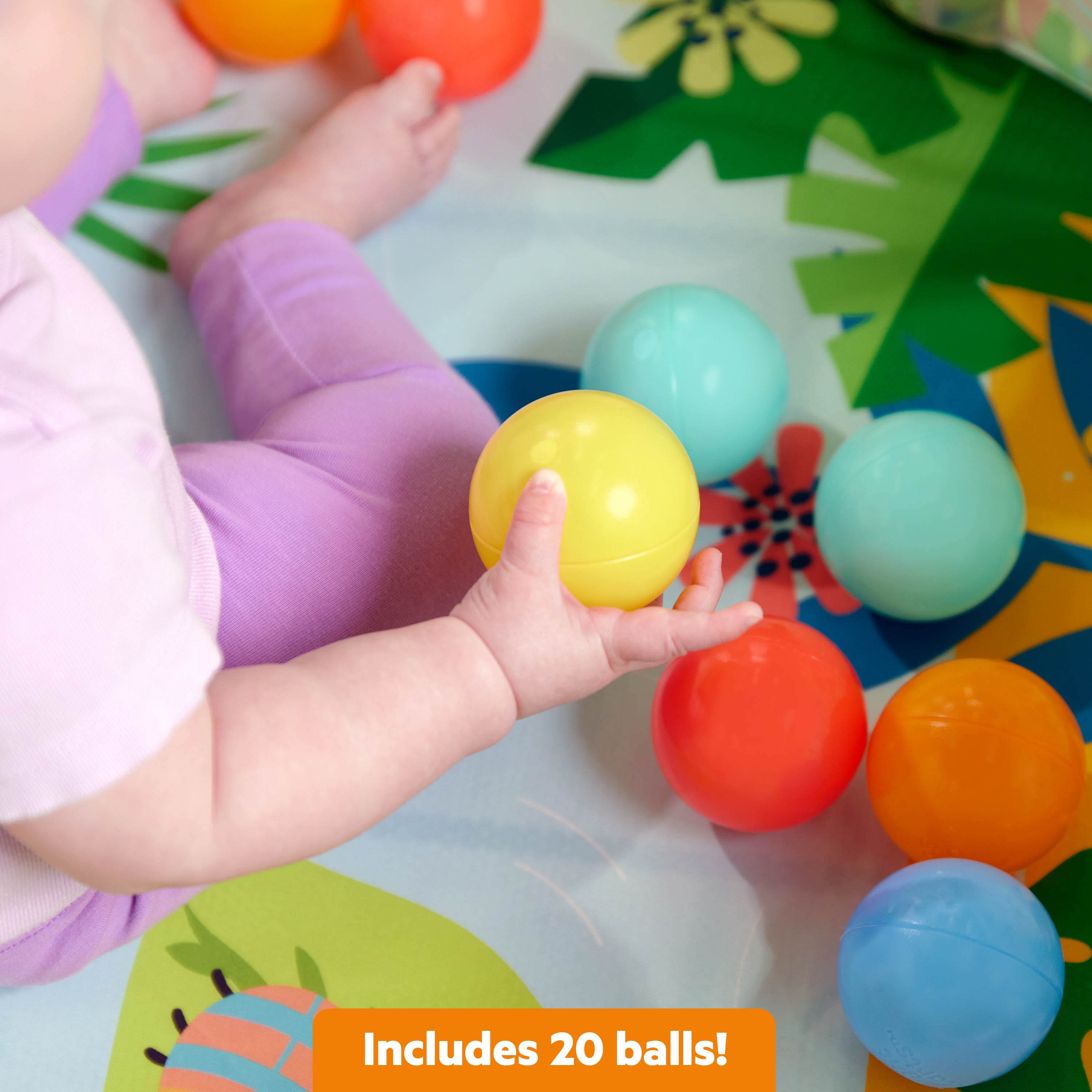 - Encourages baby’s motor skill development as they drop, grasp, toss, roll, and catch the balls; provides their own special space for sit-and-play fun