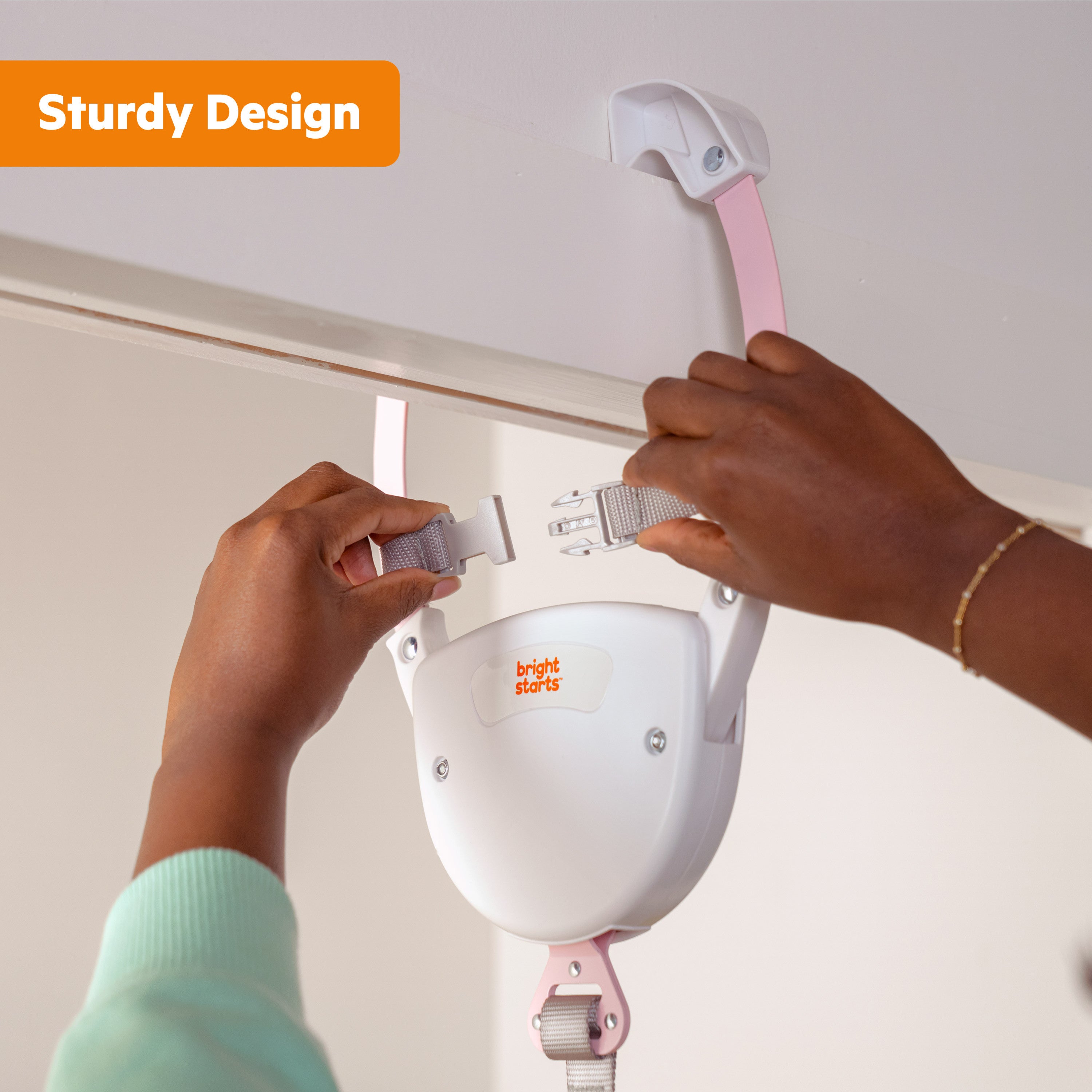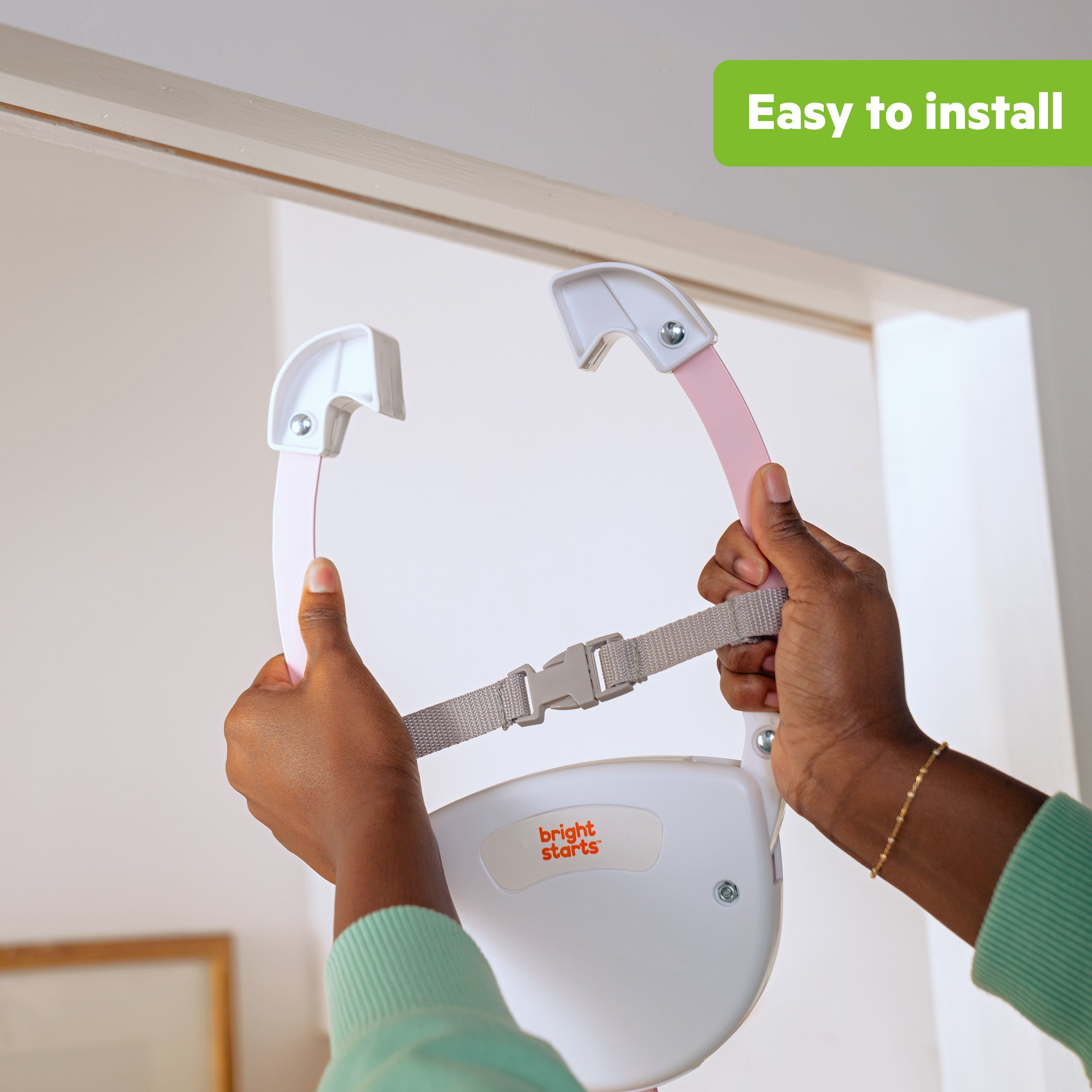 Bounce into playtime bliss with the Purple Paradise Door Jumper by Bright Starts, the #1 Manufacturer of Activity Jumpers!* This easy-to-use, supportive baby jumper is perfect for your little explorer, offering a secure, sturdy, and fun way to strengthen those growing muscles. Designed with parents in mind, it requires no tools for setup—simply clamp it to most door frames for instant jumping fun. The durable, non-twist nylon strap and no-mark clamp provide safety and stability while keeping your doors pristine. The silky, colorful Taggies provide extra comfort and stimulation as baby plays. The Purple Paradise Door Jumper is suited for babies 4-12 months, up to 26 lbs. Features a padded seat ring for baby’s comfort and machine washable fabrics for your convenience! As your bouncing baby grows, adjust the straps to the perfect height in this high-quality jumper for baby. (*Circana, Retail Tracking Service, U.S., Activity Seats/Jumpers excluding No Jumping, dollar sales, 12 months ending October 2023).