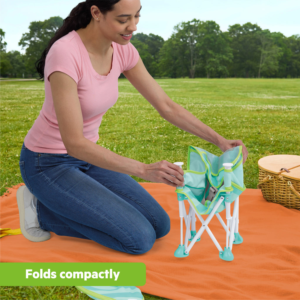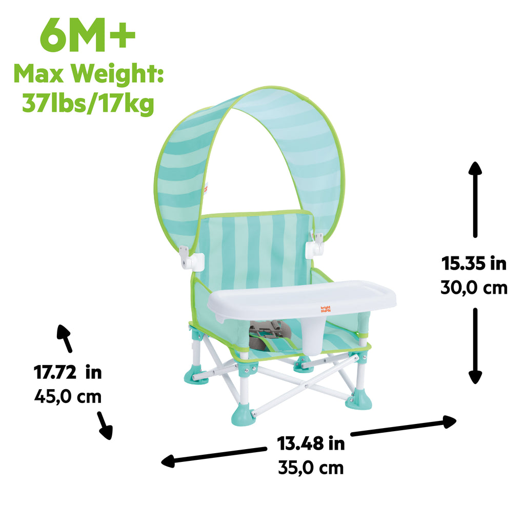 The Bright Starts Pop ‘N Sit Cabana is the original go & grow baby seat! From inside to out, baby to toddler, and mealtime to playtime, this multi-purpose travel booster offers your little one a secure place to sit… no matter what the day has in store. Features 3 modes of use: floor seat, feeding seat with removable tray, and toddler booster. For babies, attach the seat to an adult chair using the included straps and dishwasher safe tray to create a portable booster seat. For toddlers, use the seat as a booster that can pull right up to the table by removing the feeding tray. In floor mode, you can use the Pop ‘N Sit whenever you need an extra seat! The removable and rotatable canopy clips on side bars of the chair to give baby UPF 50+ sun protection on sunny days. The rear storage pocket conveniently holds your daily essentials. Chair and canopy fold compactly when not in use for easy storage and travel, and it even includes a carrying bag with a shoulder strap. Cleanup is a breeze with the dishwasher safe tray and machine washable seat pad. No assembly required. Makes a wonderful gift for baby showers, birthdays and more. Made for 6 months to 3 years old or up to 37 pounds.