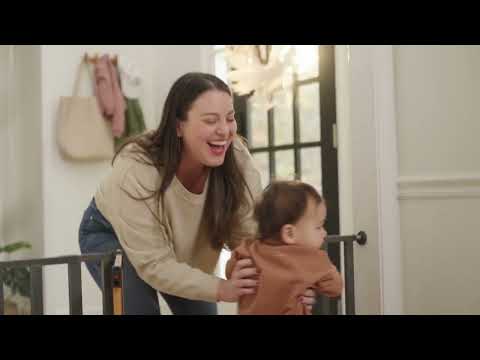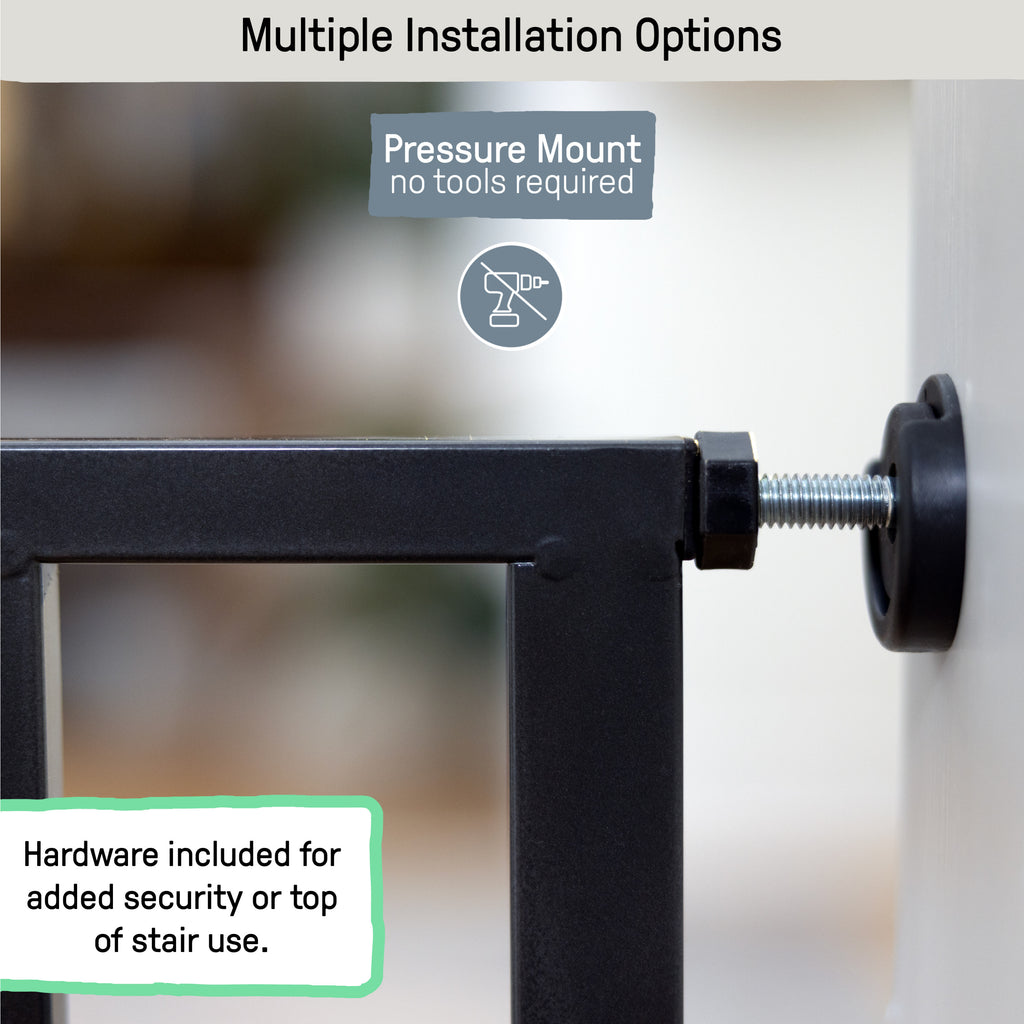 - Fits in extra-wide doorways, hallways, or bottom of stairs with easy no-drill pressure mount system; also fits at top of stairs, on walls or flat banisters, with included hardware kit (required for top of stairs)