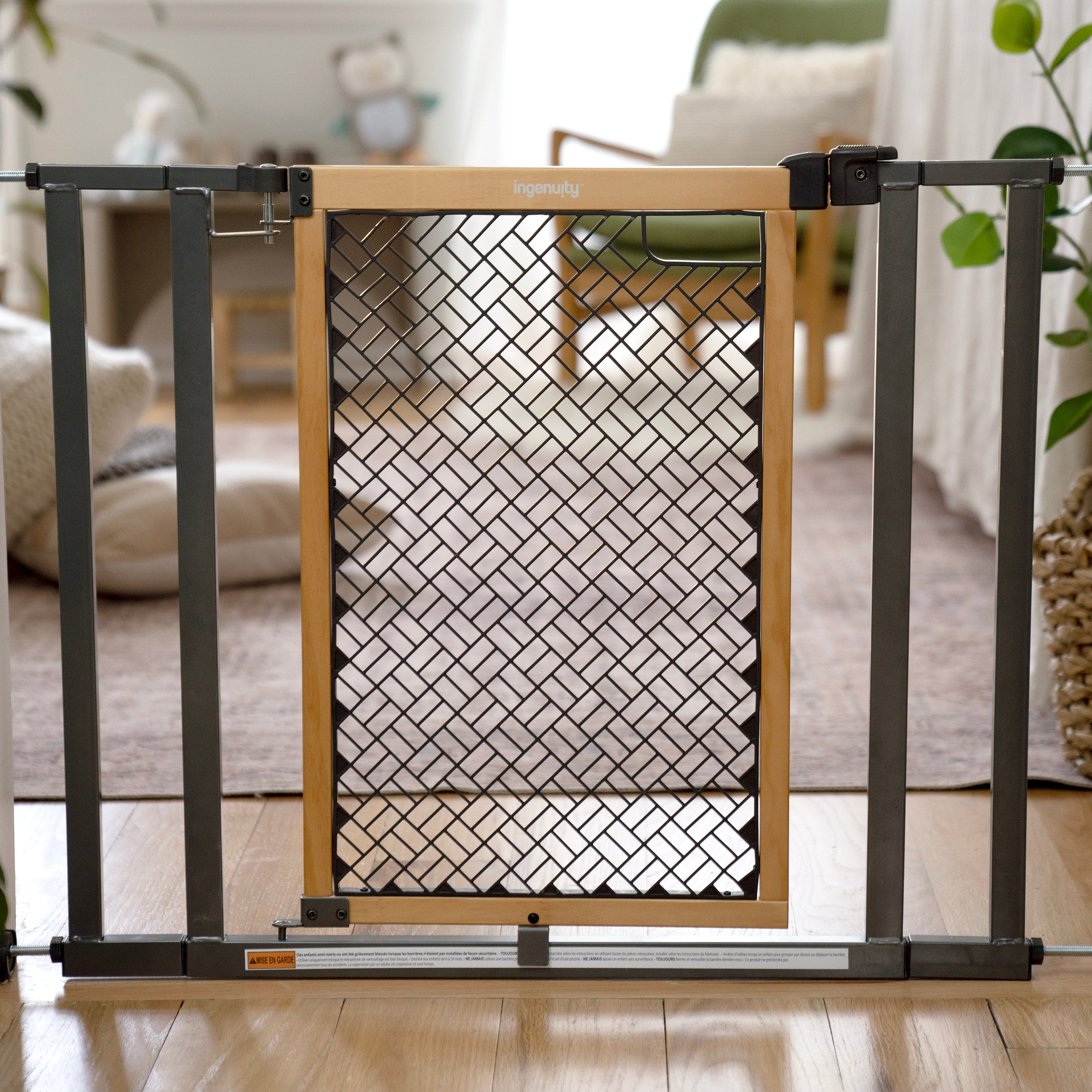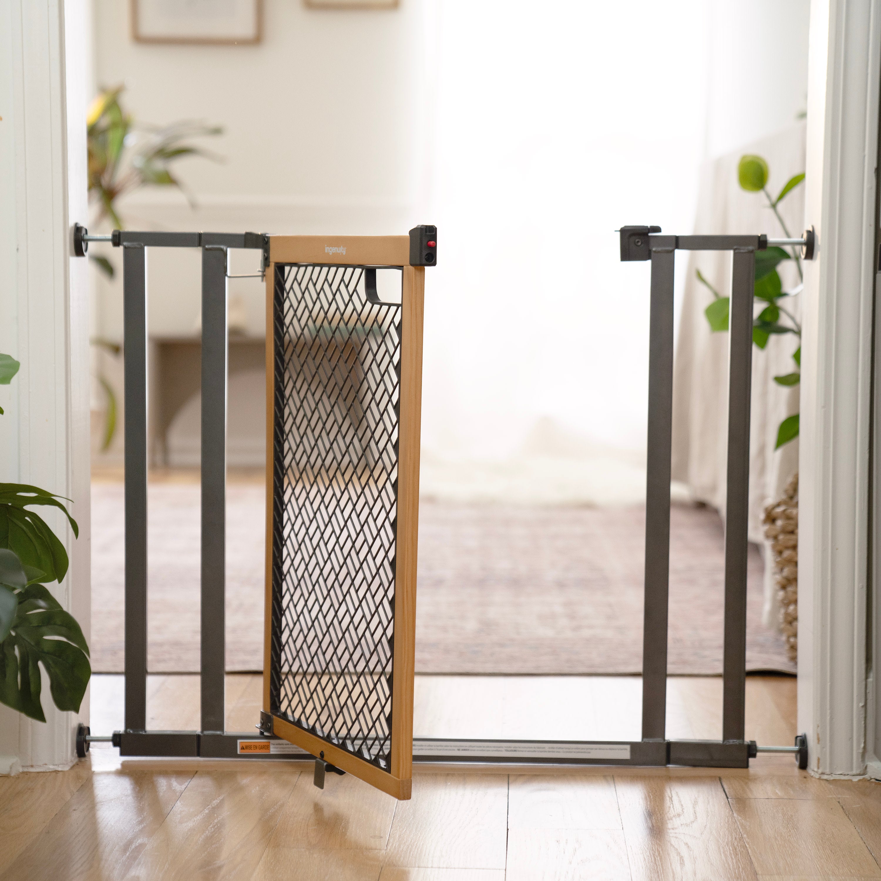 Keep your loved ones safe and secure in style with the Ingenuity Doorway 36S Series Baby and Dog Gate. Measuring 26" tall, this safety gate conveniently helps contain children and pets while complementing your home decor. The geometric design on the gate's door offers a decorative safety solution, accented with a honey oak-stained frame and sleek metal bars. Two included extensions help you configure the ideal setup for spaces from 28-36 inches wide. Install it in doorways or hallways quickly and easily using the included no-drill pressure mount system with adhesive wall cups that help protect your walls from damage. Or use it at the top of the stairs with included hardware (required for safe top-of-stairway installation). Recommended tools for hardware installation (not included): drill, Phillips-head screwdriver, pencil, measuring tape. Note: If the red zip tie is removed before stated in the instructions, the gate will appear bent until it is mounted to the doorframe with bolts tightened upon proper installation.
