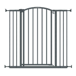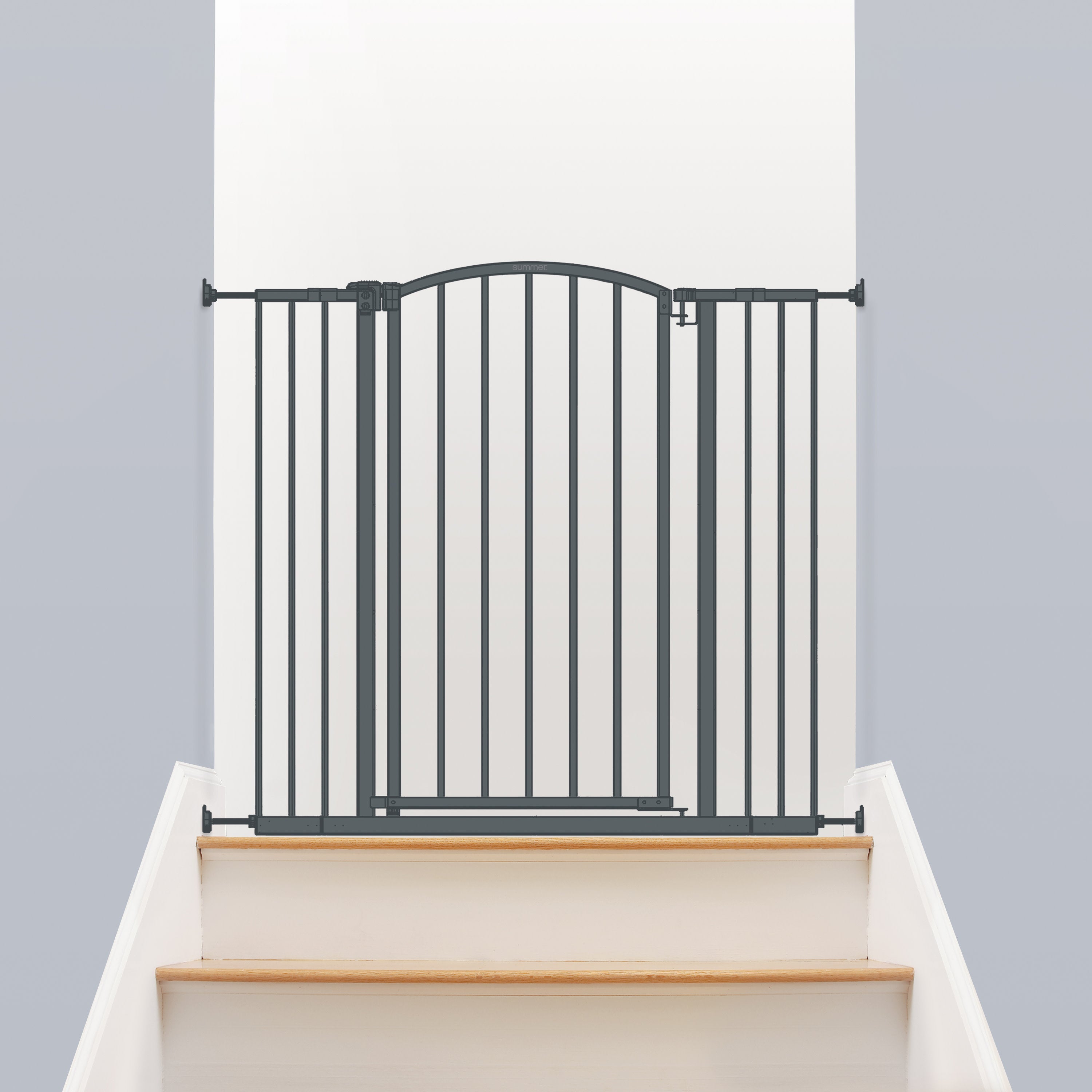 - STYLISH GATE: This decorative safety gate is made with a stylish gray finish and arched doorway, so you can child proof your home in style. Standing 36” tall, it is ideal for use with toddlers and pets.