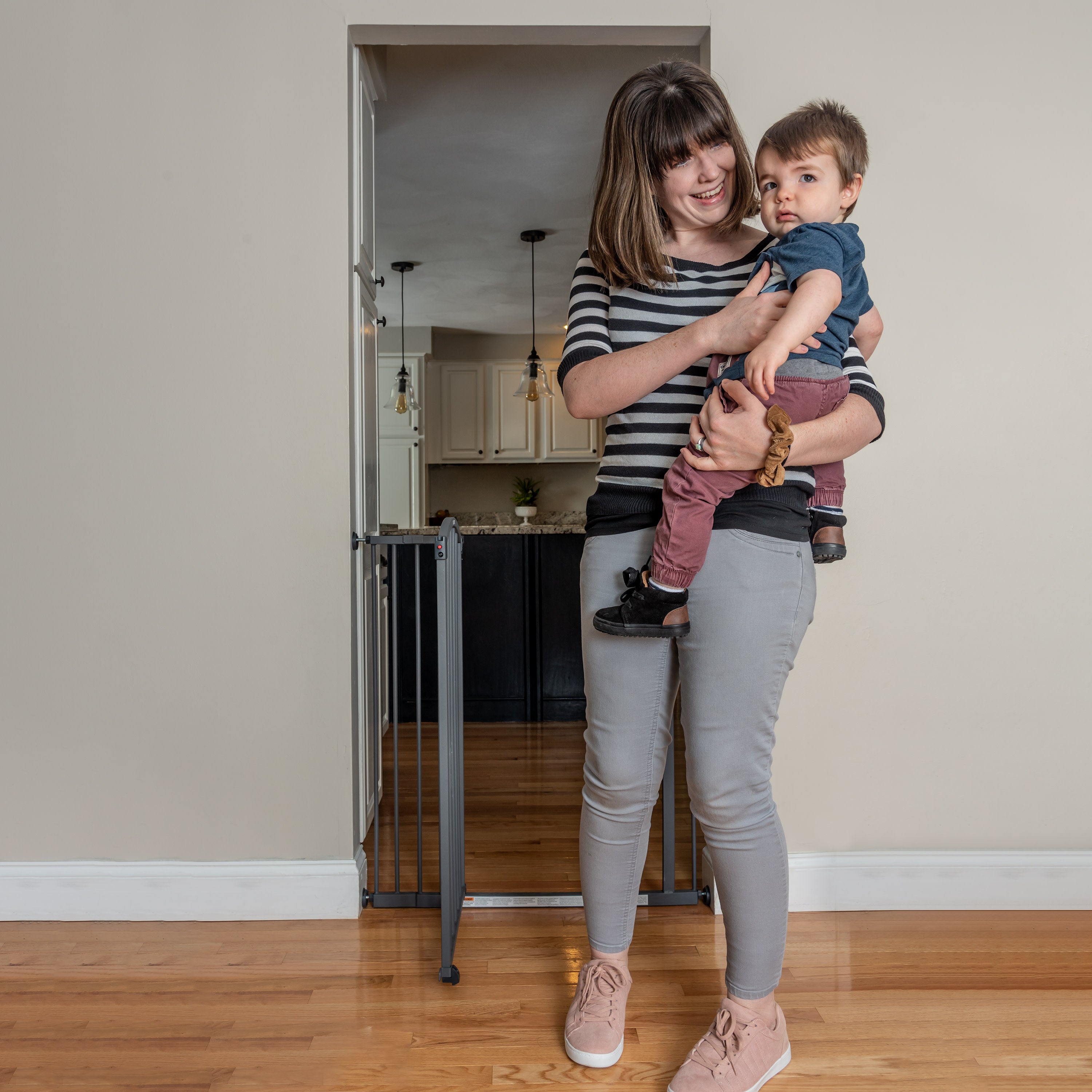 Child proof your home in style with the Summer Extra Tall Decor Safety Gate. The stylish gray metal frame of this gate will compliment any home décor and is perfect for doorways, hallways, and stairways. Ideal for toddlers and pets, this 36” extra tall safety gate can fit openings anywhere from 28” to 38.25” wide. Plus, it features a 20-inch wide door, making it easy to walk through. When used between rooms, this extra tall safety gate has a simple, one-handed walk-thru door allowing parents to move easily from room to room. Plus, included door stopper will help provide extra security at the top of stairs. Easily install this safety gate on stairways with the included kit or between hallways or doorways with the no drill mount. Tools are required for hardware mounting.