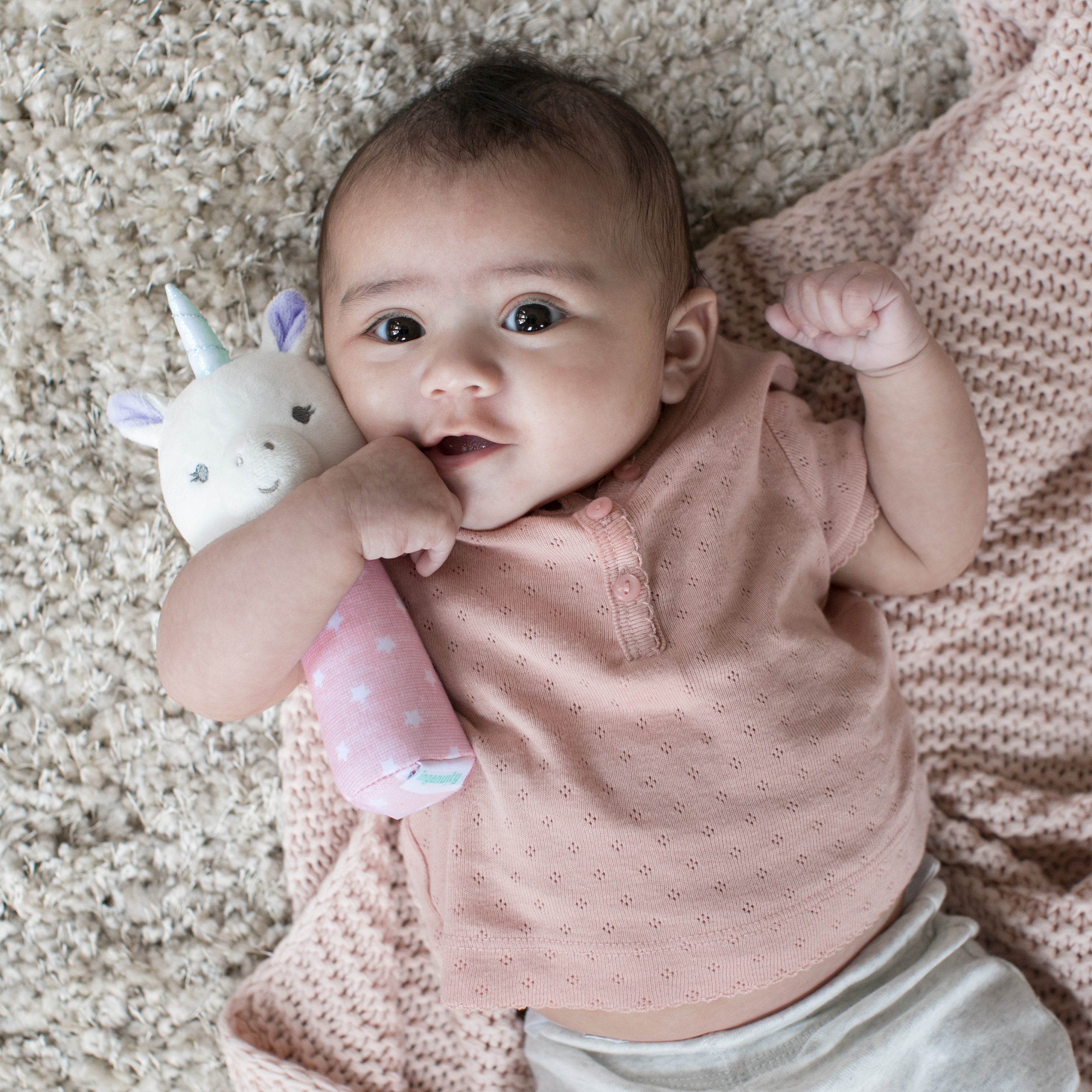 Have your phone ready for a photo burst when your baby masters her new grasping skills. The Shimmy Handheld Rattle from Ingenuity is made with a stick rattle design that’s easy for infants to hold. With a combination of plush fabrics, this sweet plush rattle toy is fun for little fingers to explore and comfortable to shake and hold. Delicate beads create a classic rattle sound. Baby unicorns are called shimmers – so cute, right?! We believe in unicorns, and Shimmy believes in you.