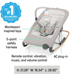 From bottles to belly-rubs to blankies, we've all had days where nothing seems to keep baby calm. Those are the moments that inspired us to create the Keep InMotion Automatic Rocking Seat, with plenty of options to soothe, calm, and entertain baby. This rocker features 2 speeds, so as baby explores each rhythm you can select the one that suits them best. With the switch of a button on the included remote control, you can give baby a seat that mimics your own gentle rocking motion, with 2 recline options for another level of comfort. Plus, the remote clips onto the attached loops to ensure it stays within parent's reach. In addition to rocking, this chair offers soothing vibrations and calming music with volume control. We use GentleTouch technology to make controls even easier for parents, grandparents, and babysitters to understand and navigate, so your little one can use their favorite features no matter who is looking after them. As baby rocks, or even when they don't, they can entertain themselves with the included plush hot air balloon toy or wood ring with sensory tags, all on the removable toy bar. This rocker fits perfectly in any modern house, with a chic frame, woven fabrics, and a quilted plush center. Plus, the machine-washable seat pad makes it easy to clean and the foldable design makes it convenient to store or take along with you with the included carry bag. For any household looking to keep baby calm, this rocker makes the perfect addition. From the #1 Manufacturer of Bouncers* (*Circana, US Dollar Sales, Jan-Dec ‘24).
