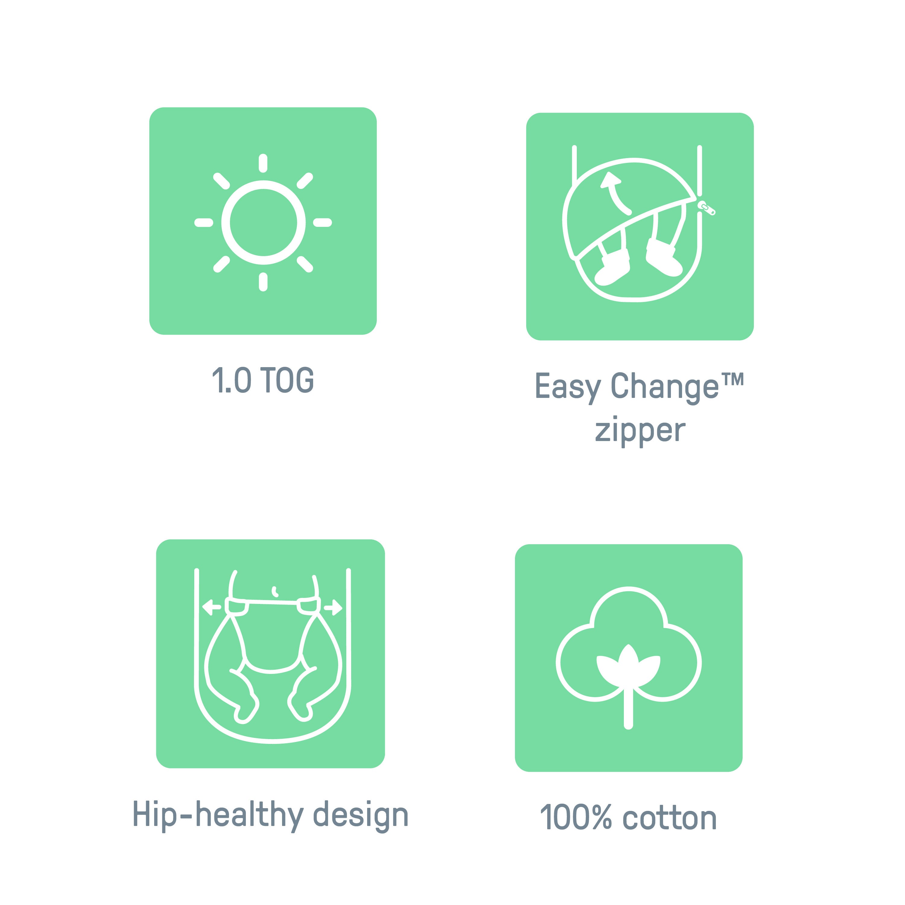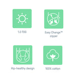 Keep your baby calm and comforted with the SwaddleMe by Ingenuity Easy Change Swaddle. This 1.0 TOG swaddle fits babies ages 0-3 months, 7-14 pounds, and up to 26 inches long. Made for parents' ease and baby's comfort, this swaddle is designed with a Easy Change zipper along the bottom hem for convenient diaper changes. The zipper allows you to open the bottom of the swaddle without unwrapping your little one or disturbing their sleep. The easy-to-use swaddle wrap creates a snug, womb-like feeling for your precious baby. Simply position the adjustable wings around your baby and press on the hook-and-loop closures to secure. The closures prevent the swaddle from loosening, therefore keeping baby safely secure. The cozy fit of this swaddle helps prevent the startle reflex that can wake baby. The hip-healthy design leaves plenty of room for baby to move. This soft swaddle is made of durable natural fiber (100% cotton) and is machine-washable for easy cleaning. This baby swaddle blanket wrap is part of Stage 1 in the SwaddleMe Stages of Sleep, made for newborns who aren't rolling over yet and like to be swaddled with their arms in. When baby starts showing signs of rolling, transition to Stage 2. The SwaddleMe by Ingenuity Easy Change Swaddle is a great addition to any baby shower registry!