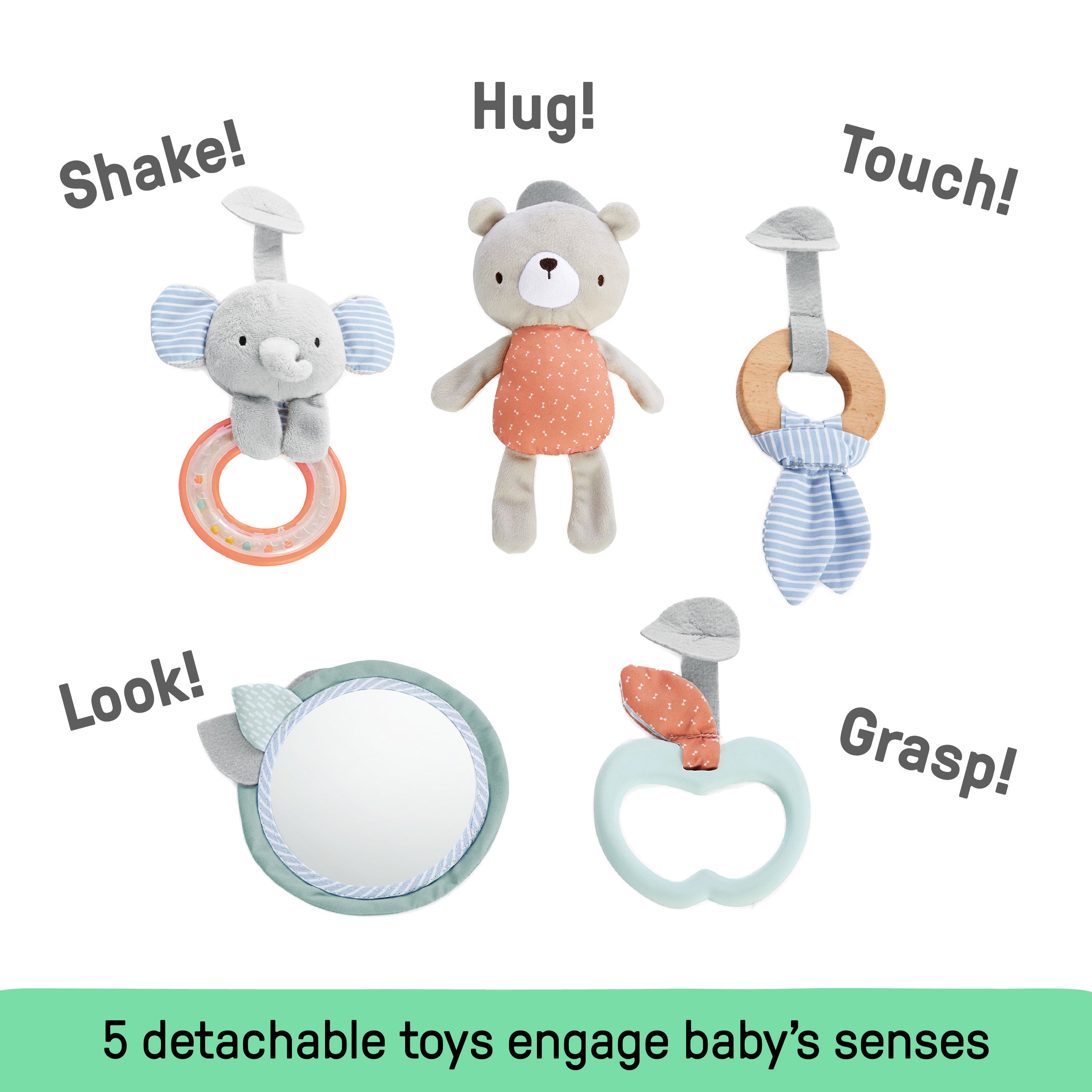 - Includes tummy time pillow to help strengthen neck muscles and prevent flat head, 5 detachable toys made of natural materials: silicone apple toy, plush bear, wooden ring toy, mirror, and a bead rattle