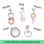- Includes tummy time pillow, 5 detachable toys made of natural materials: silicone apple toy, plush bear, wooden ring toy, mirror, and a bead rattle