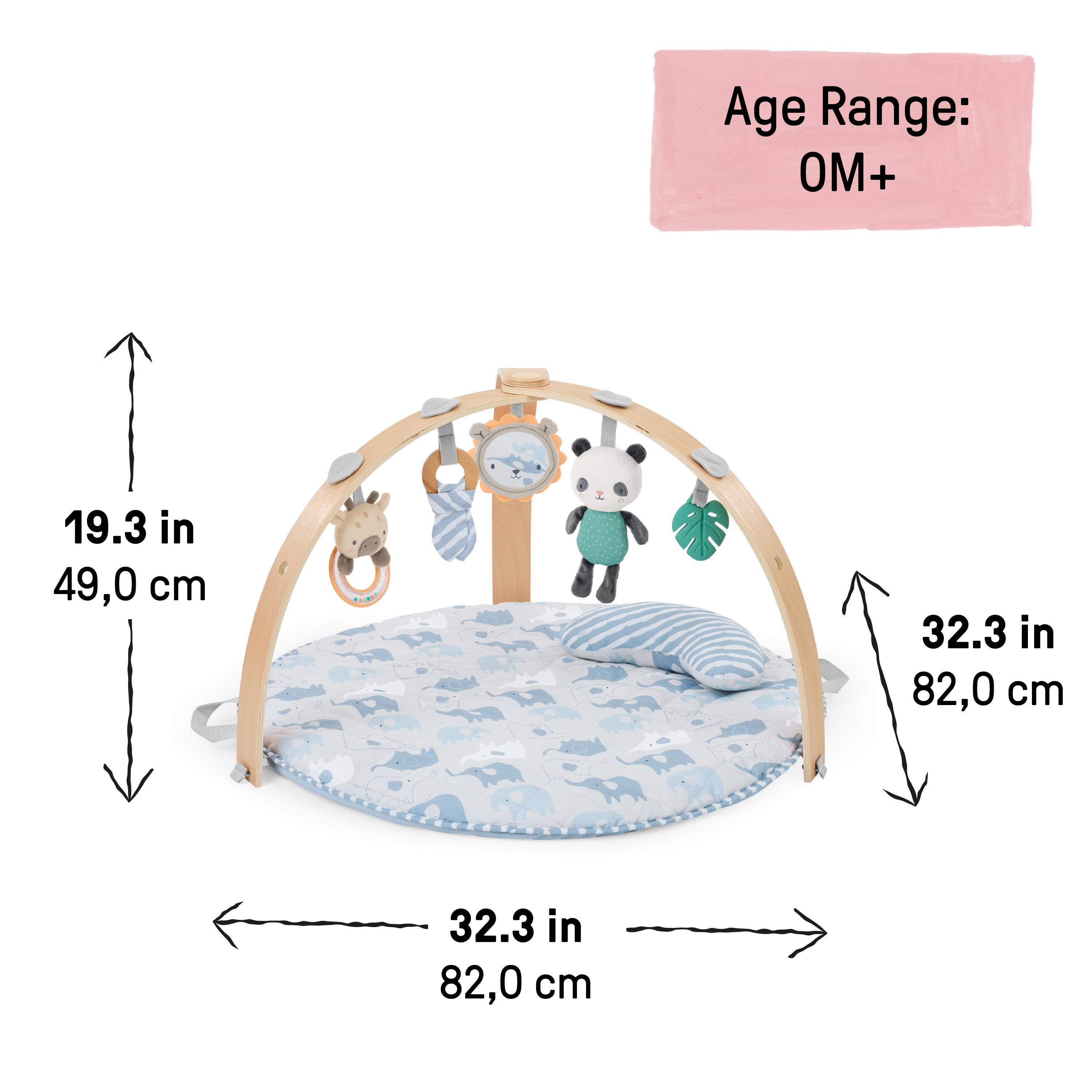 - Includes tummy time pillow, 5 detachable toys made of natural materials: silicone leaf toy, plush panda bear, wooden ring toy, lion mirror, and a giraffe bead rattle