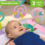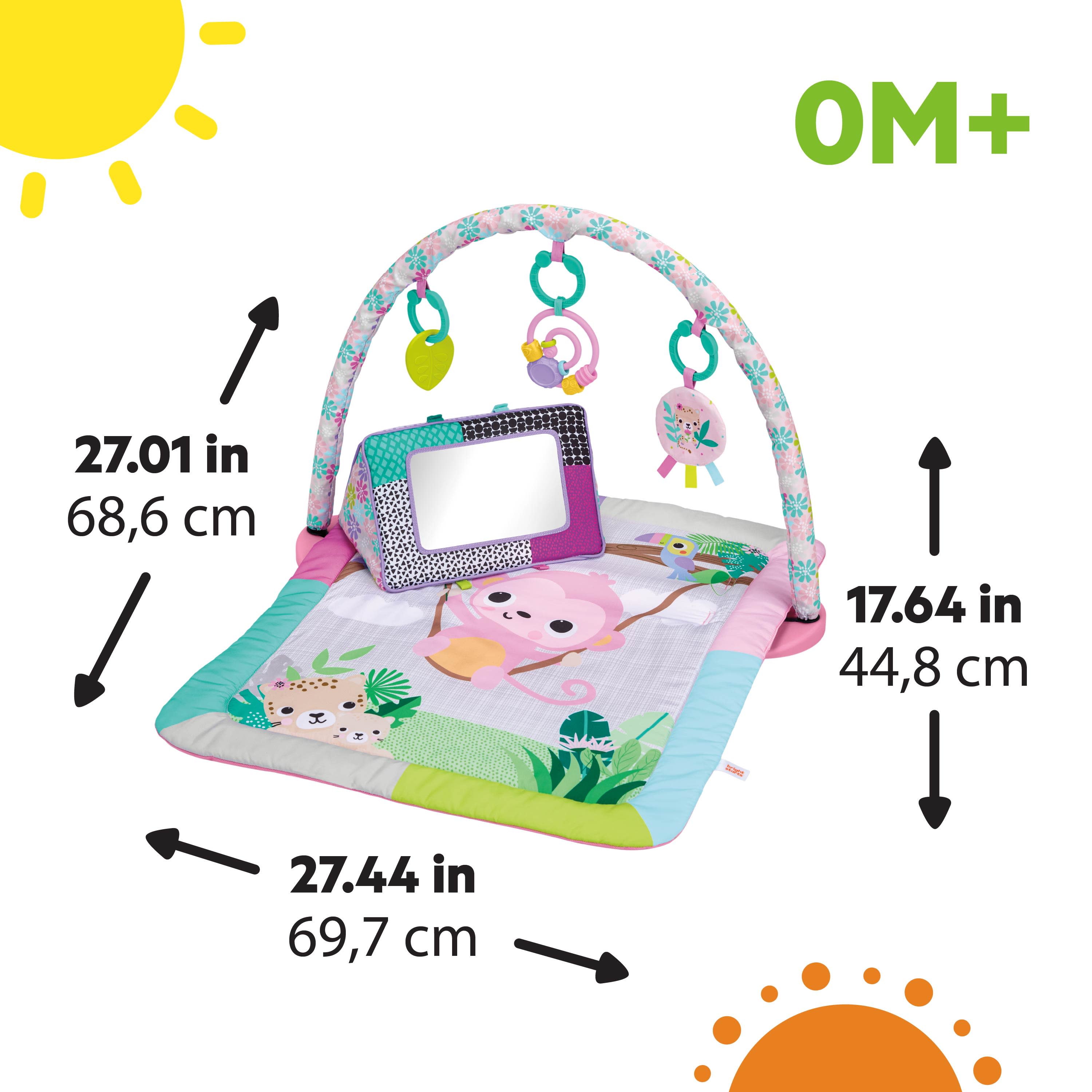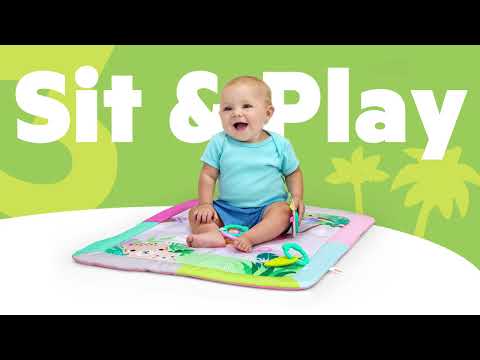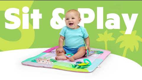 Tummy time just got a perfectly pink tropical upgrade! The Treetop Bloom Activity Gym from Bright Starts brings big giggles in a portable size, with 3 ways to play: tummy time, lay & play, or sit & play. The removable toy bar canopy dangles colorful toys to keep baby reaching, stretching, and smiling through every stage. Practice fine motor skills with the bead chaser toy, touch and squeeze the crinkle medallion, explore the textured leaf toy, learn numbers with the flash cards, and practice self-discovery with the mirror. When it’s time to head out, just remove the toys and take the fun on the go! This pink jungle-themed play gym features cheerful animals and 7 link loops to swap in baby’s favorite toys. Play mat is machine washable, other parts wipe clean. Get the party started early – made for ages newborn and up!