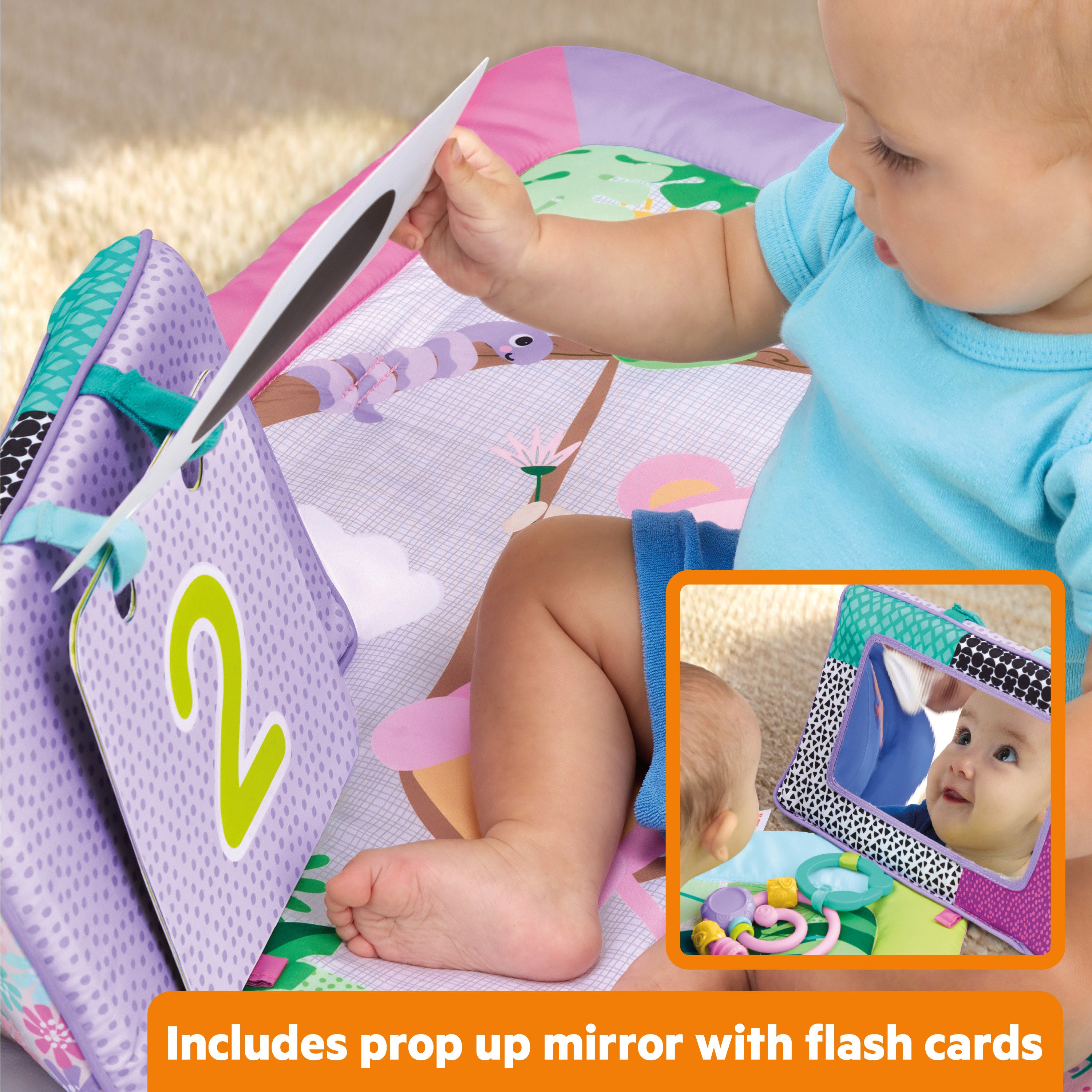 - Includes 5 toys and accessories: bead chaser, textured leaf, crinkle disc with Taggies, and prop-up mirror with flash cards & high-contrast images to stimulate baby’s senses