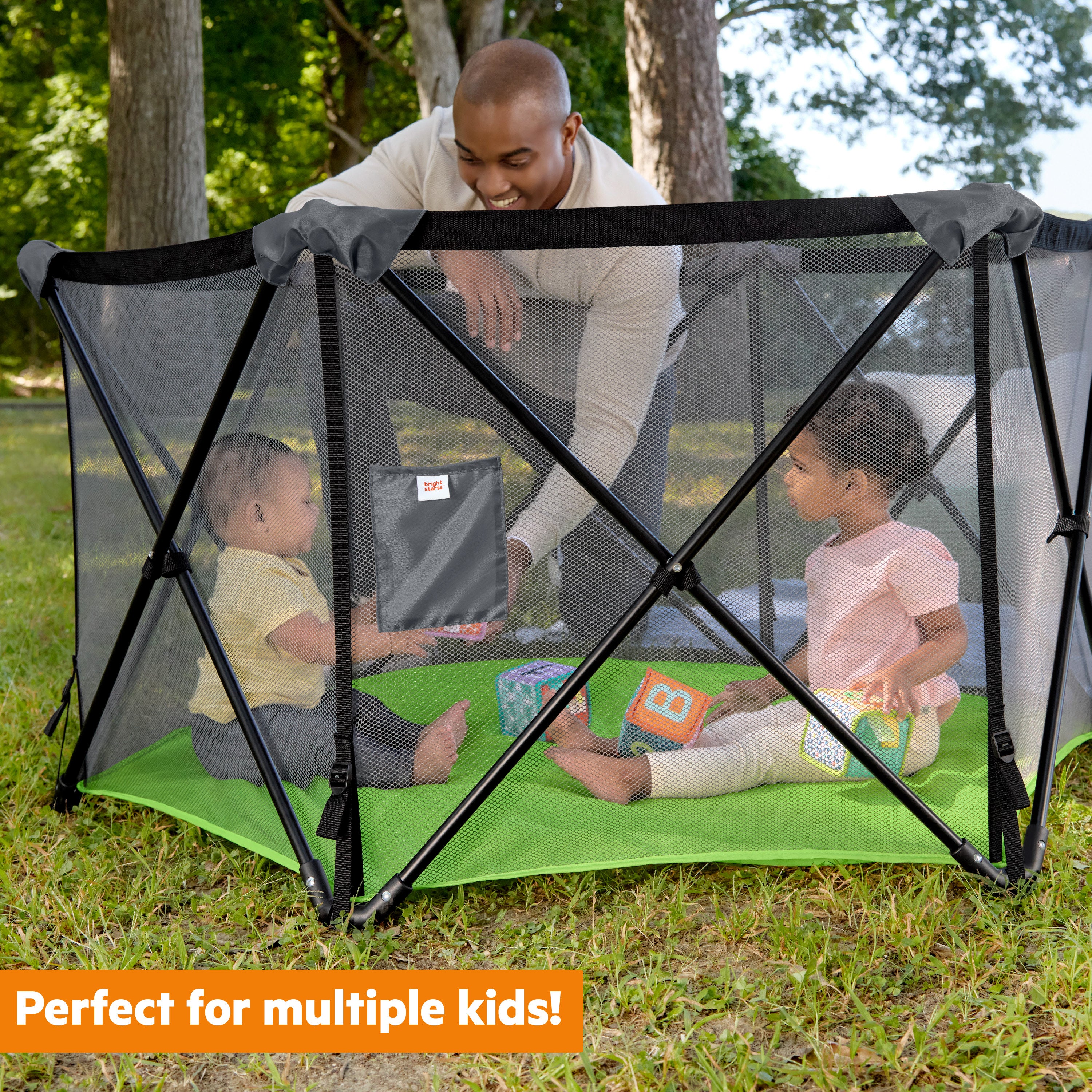 - INDOOR/OUTDOOR USE – Whether playtime is indoors or out, keeping your little one in one place is essential. The Bright Starts Pop ‘n Play Portable Playard provides 14 square feet of contained playing area, and the folding metal frame weighs only 12 pounds.