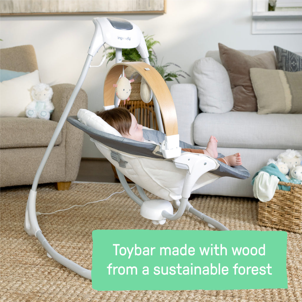 - Entertain baby while complementing your home décor with the Ingenuity SimpleComfort Compact Soothing Swing - Parker! The rotating and removable toy bar - made with wood from a sustainable forest - adds a touch of luxe detail
