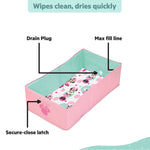 Magically transform any shower into a bathtub with the Disney Baby Minnie Mouse Tuckaway Travel Tub by Bright Starts! Simply unfold this adorable Minnie Mouse themed tub in any shower at home or away, fill it with water, and help your kiddo get clean in their own safe, comfy spot! Traveling? No problem. Camping? Use the tub inside or in the great outdoors! This waterproof lined tub unfolds to reveal a sweet Minnie Mouse design and plenty of room for babies 12 months old to kids up to 5 years old. When bathtime is over, simply fold the travel tub for storage. When fully open, the full size baby bathtub is 30" L x 15.5" W x 8.5" H. When folded, it's almost completely flat! With a max fill line to keep an eye on water levels and a drain plug for quick release, it's easy to keep baby safe as you help them enjoy bath time. The baby tub's waterproof lining is easy to clean and dries quickly, so you can return your shower to normal just moments later. Give your little one a spacious tub all their own with Minnie Mouse!