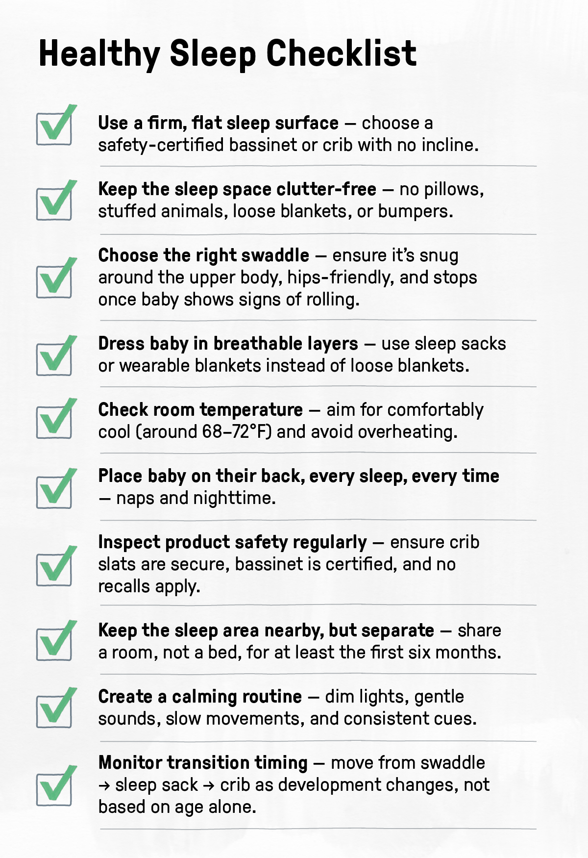 Only a firm mattress and fitted sheet — no pillows, blankets, toys, wedges, or bumpers.