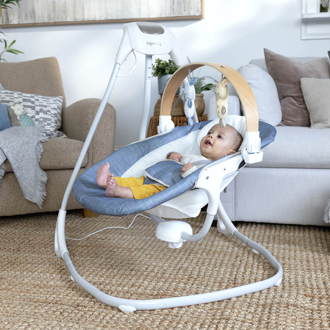 Entertain baby while complementing your home décor with the Ingenuity SimpleComfort Compact Soothing Swing. The rotating and removable toy bar - made with wood from a sustainable forest - adds a touch of luxe detail.