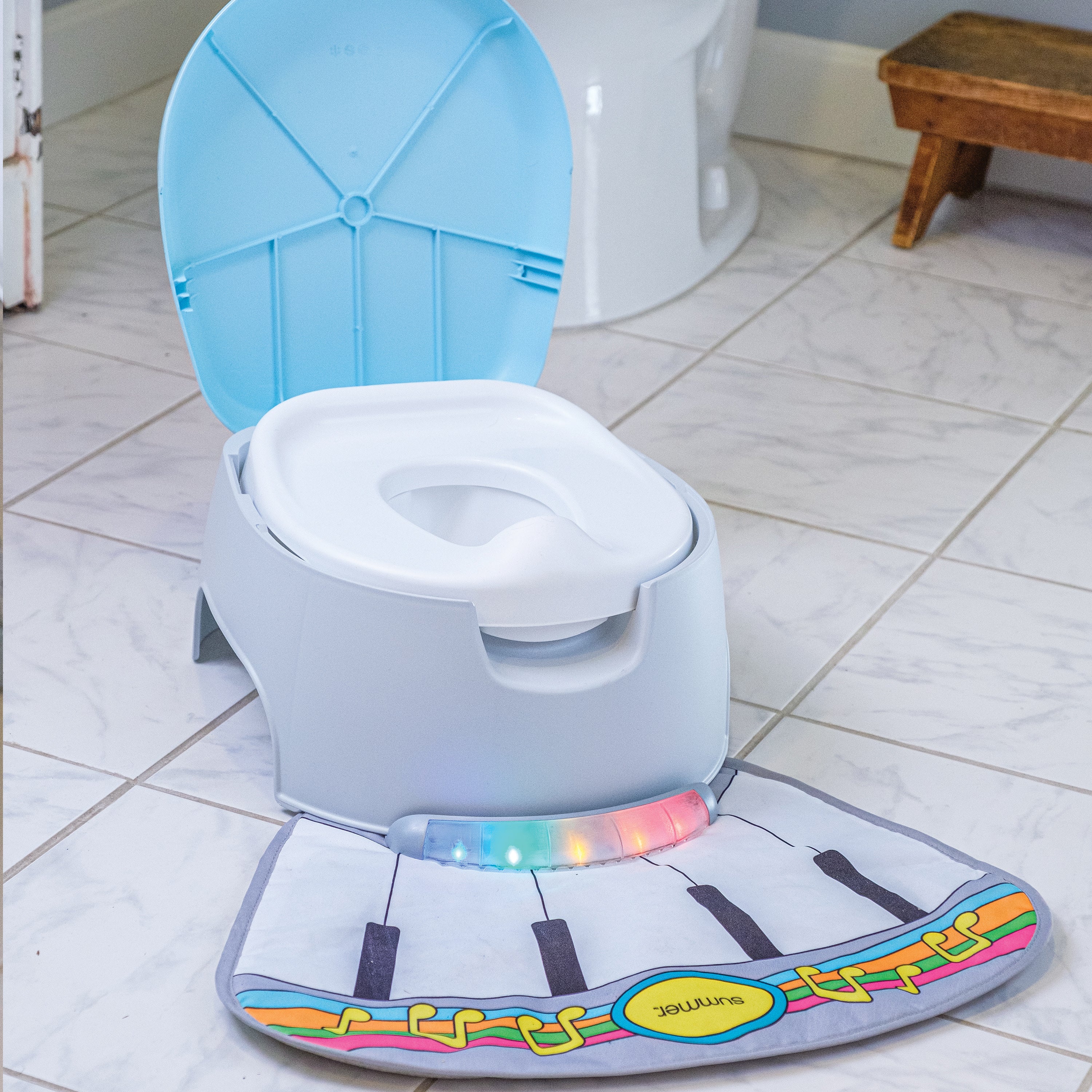 - INTERACTIVE FOOT MAT: The interactive foot mat features entertaining songs and sounds to keep your little one occupied during the potty training process. Toddlers can use their feet to play five different tunes, music notes, and percussion sounds, with fun blinking lights that move to the beat!