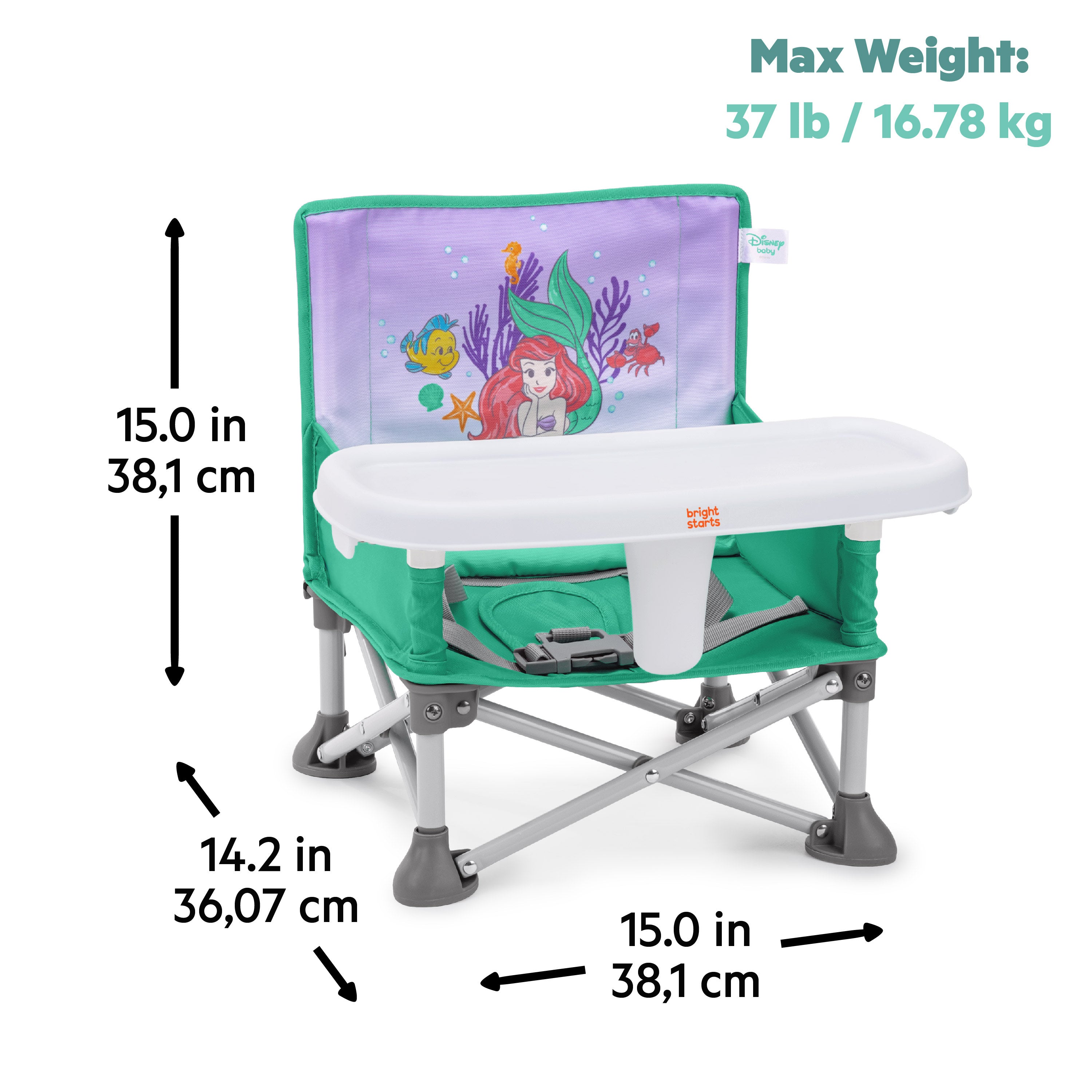 Make a splash with the Original Pop ‘N Sit portable booster from Bright Starts, with over 2 million sold! From inside to out, baby to toddler, and mealtime to playtime, this multi-purpose travel booster offers your little one a secure place to sit - no matter what the day has in store. Features 3 modes of use: floor seat, feeding seat with removable tray, and toddler booster. For babies, attach the seat to an adult chair using the included straps and a tray to create a portable feeding seat. For toddlers, use the seat as a booster that can pull up to the table by removing the tray. In floor mode, you can use the Disney Princess Ariel Pop ‘N Sit whenever you need an extra seat - picnics, sporting events, or right at home! The rear storage pocket holds your daily essentials. Folds compactly when not in use and includes a carrying bag with shoulder strap. Features a dishwasher safe tray and machine washable seat pad. Dimensions: 15 x 13.5 x 14.75” or 5 x 15” when folded. Made for 6 months to 3 years old or up to 37 lbs. #1 Booster* (*Circana, LLC, Retail Tracking Service, US, Highchairs, Boosters, Unit Sales, January - December 2024).