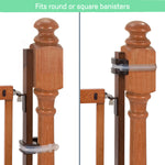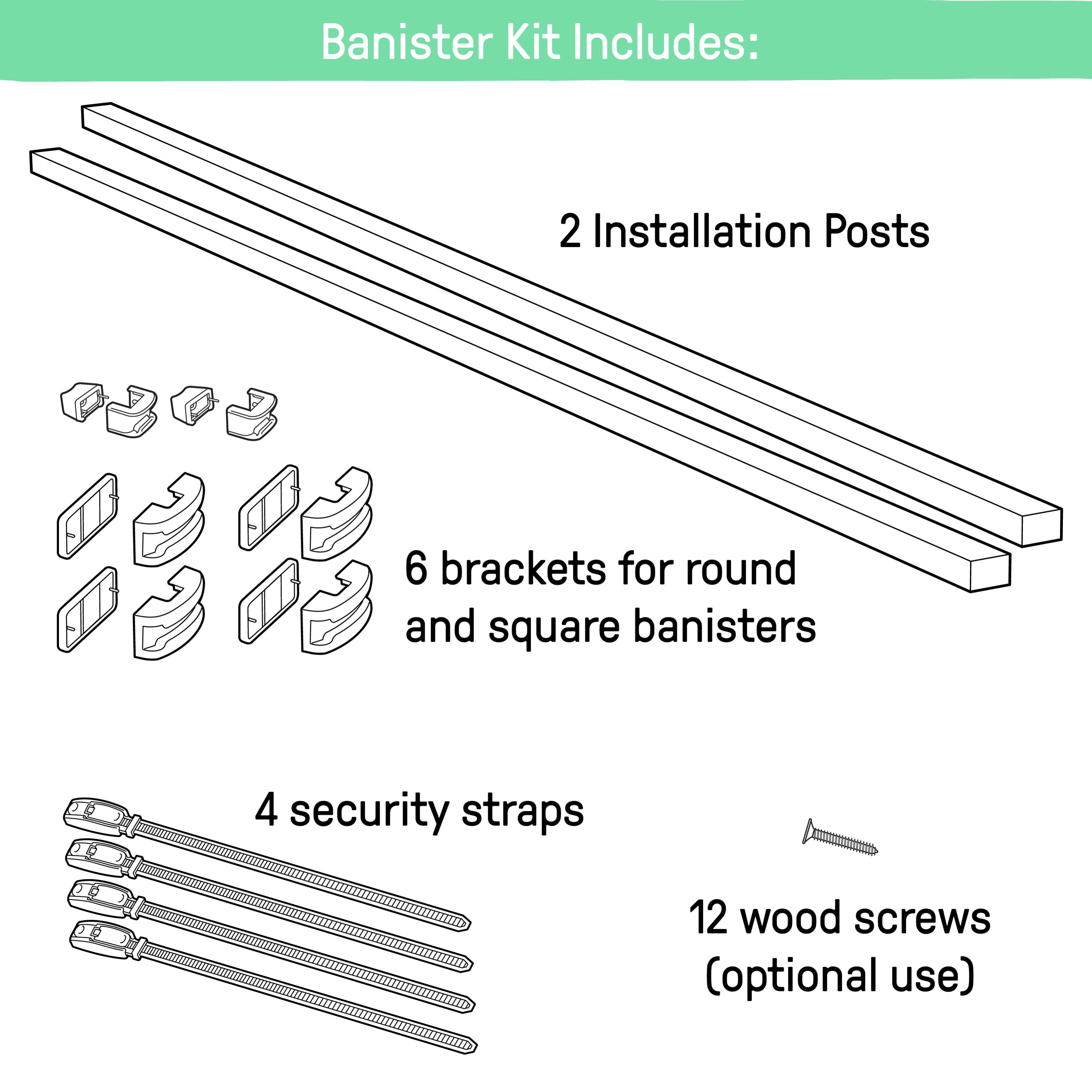 - Includes two installation posts, six brackets for various banisters, four security straps, and optional wood screws for added stability